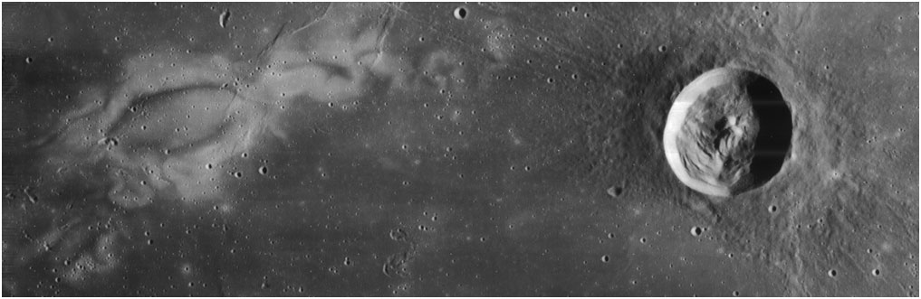 FIG. 1. The Reiner Gamma formation (7.4"N, 300.9"E) is an example of a lunar swirl. Pictured here on the left-hand side of the image. Reiner Gamma is named after the Reiner impact crater shown for comparison on the right. The crater is 117 km to the east and has diameter of 30 km with a depth of 2.6 km. By contrast, the unusual diffuse swirling of the formation and concentric oval shape has fluidlike wisps that extend further to the east and west. Its distinctive lighter color stands out against the flat, dark surface of Oceanus Procellarum. Unlike crater ejecta, the shape of the formation appears unrelated to any topographic structures that would account for its presence. Image courtesy of NASA.